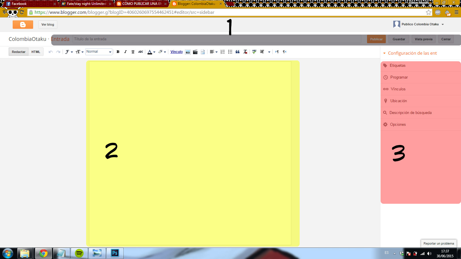 2) una vez estés dentro escoges el blog Colombia Otaku, ve a la barra del lado izquierdo y busca el botón ENTRADA NUEVA. una vez das click te aparecerá el panel de creador de contenido de publicaciones. El cual básicamente se compone en tres grandes partes: